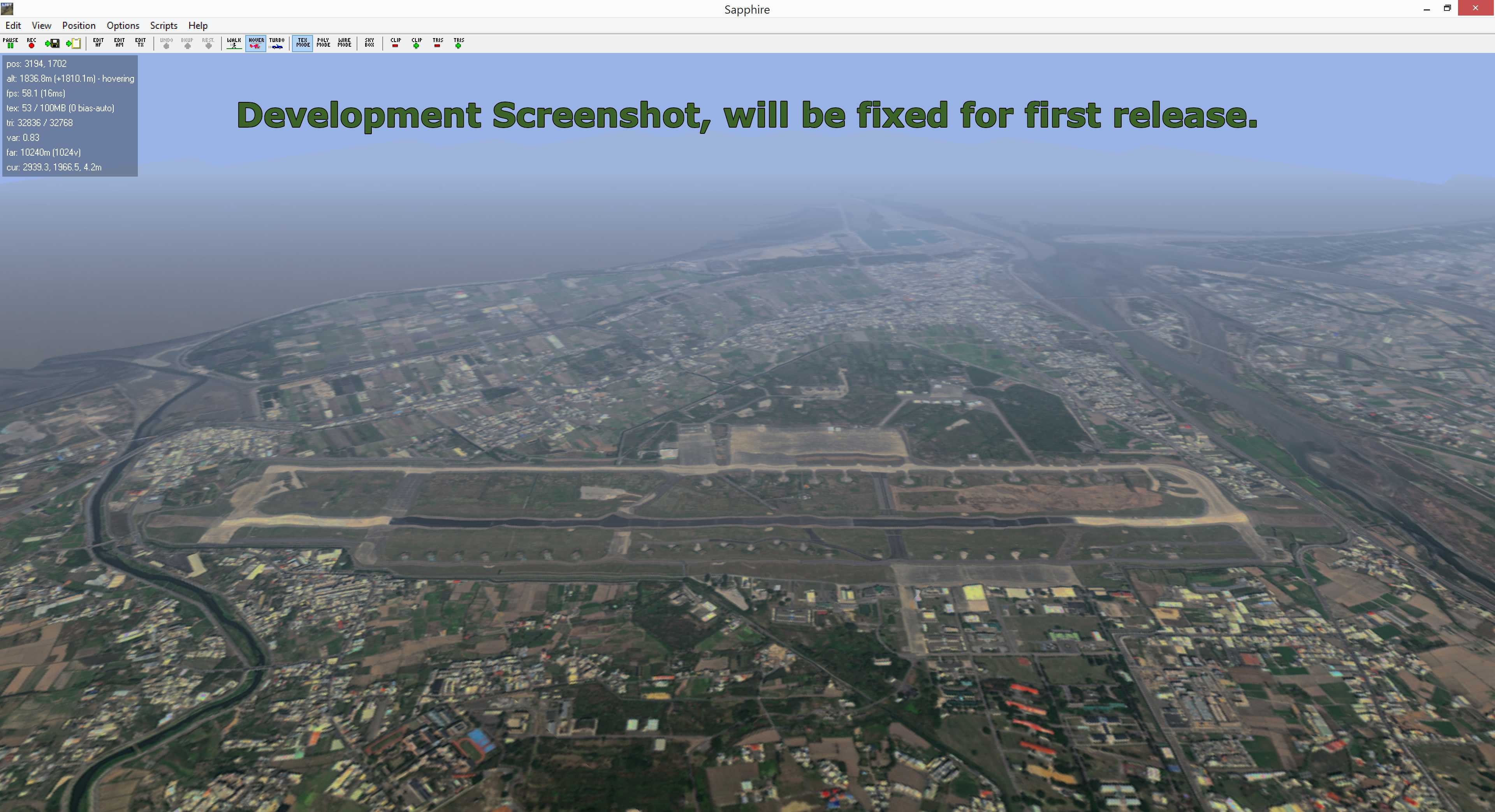 In L3DT imported heightmap-final.asc and L3DT_texture_map.png which is the 8192 x 8192 pixel resolution darkened satellite texture. Used 3D sapphire to fly by the airfield.
